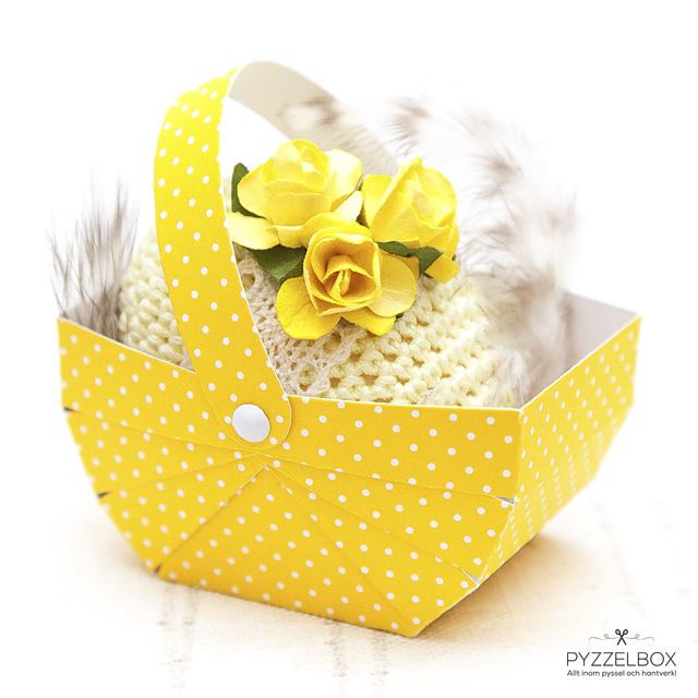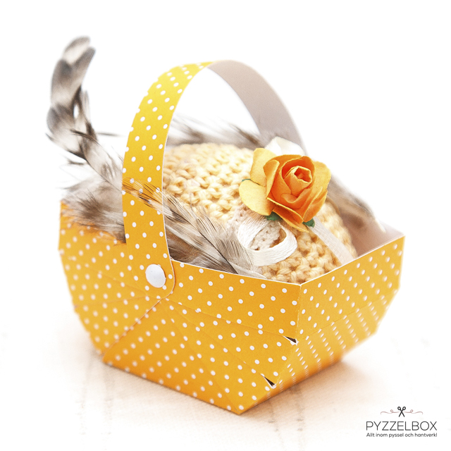 Om du vill kan du lägga äggen i en söt liten korg med fjädrar som pricken över i:t. Tina har stansat ut korgarna i olika scrapbookingpapper efter en stansmall som hon sedan har satt ihop med små metallnitar. Gulligt va?
