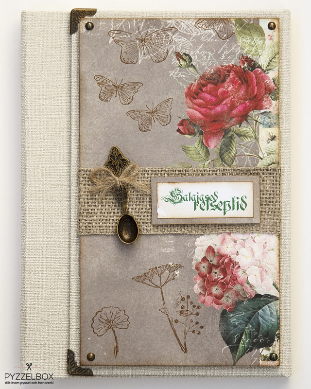Som grundmaterial för övertäckning av boken har Tina använt sig av linnefärgat kalikåtyg från vårt sortiment i webbutiken som hon har limmat scrapbookingpapper över. Övriga dekorationer på boken är bland annat metallnitar, antikguldfärgade bokhörn samt ett vitt spetsband. Texten som här i exemplen är på estniska kan självklart bytas ut till den text som du själv önskar. :)