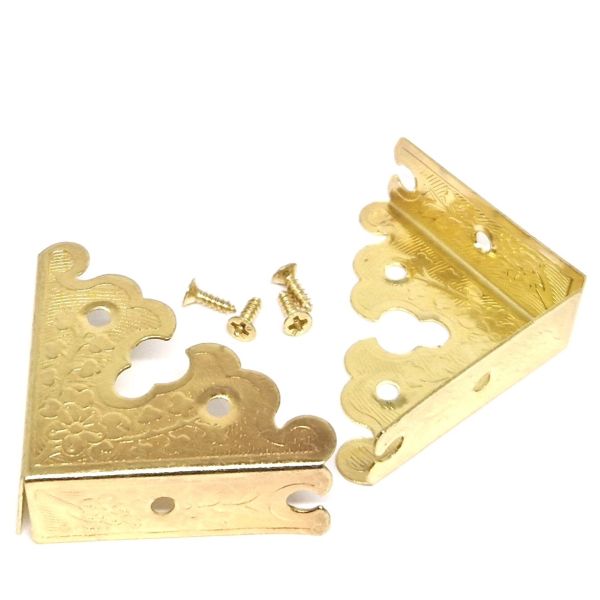 Dekorationshörn tillverkade i metall. Passar som dekoration och för att skydda hörn på trälåda, hylla eller träbord. Fyra spikar medföljer.