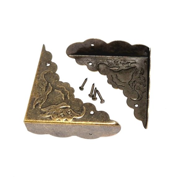 Dekorationshörn tillverkade i metall. Passar som dekoration och för att skydda hörn på trälåda, hylla eller träbord. Fyra spikar medföljer.