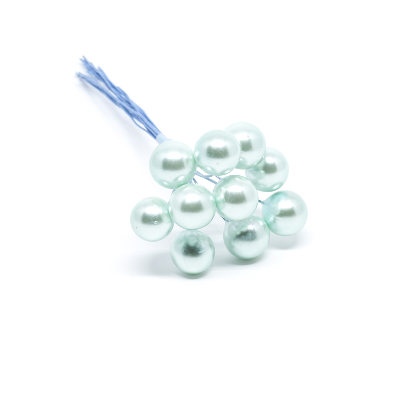 Dekorationsbär med fint pärlemorskimrande yta, fäst på en ståltrådsstjälk i liknande färg. Ståltråden är mjuk och lätt att forma till önskad form. Perfekt att använda för att ge det där lilla extra till dina olika dekorationsprojekt! De cirka 13 millimeter breda bären sitter på en cirka 8 centimeter lång stjälk. Pris per set (10 stycken bär).