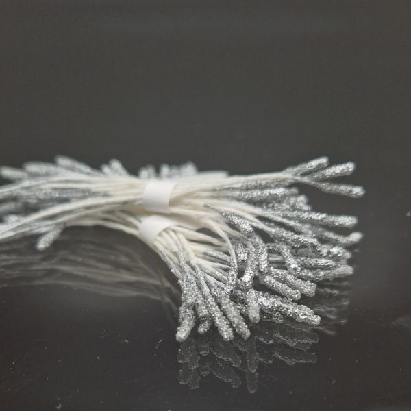 Dekorationspistiller med en vacker yta som liknar frost, fästa på tråd. Fina att matcha med olika blomsterarrangemang till kort, presentinslagningar och andra layoutprojekt. De cirka 2 millimeter breda pistillerna finns i båda ändarna av stjälken som är cirka 5 centimeter lång.