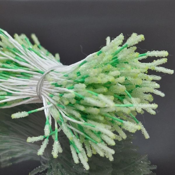 Dekorationspistiller med en vacker yta som liknar frost, fästa på tråd. Fina att matcha med olika blomsterarrangemang till kort, presentinslagningar och andra layoutprojekt. De cirka 2 millimeter breda pistillerna finns i båda ändarna av stjälken som är cirka 5 centimeter lång.