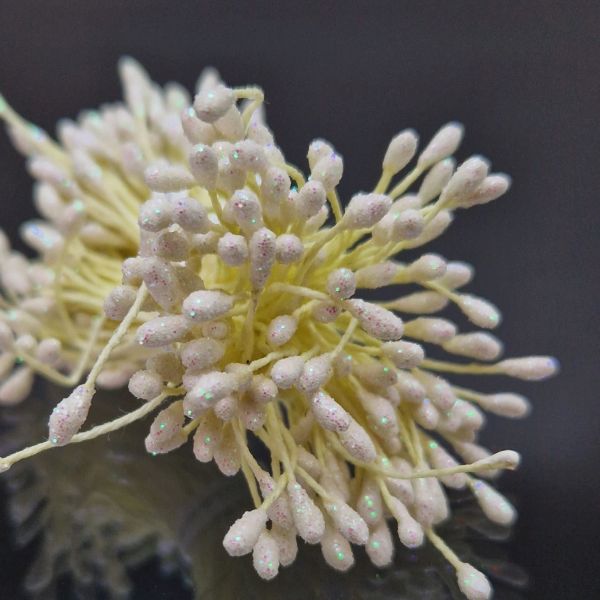 Små dekorationspistiller med fin glans, fästa på tråd. Fina att matcha med olika blomsterarrangemang till kort, presentinslagningar och andra layoutprojekt. De cirka 2 millimeter breda pistillknopparna finns i båda ändar av stjälken som är cirka 6 centimeter lång.
