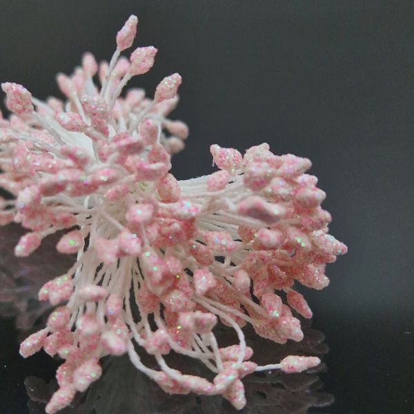 Små dekorationspistiller med fin glans, fästa på tråd. Fina att matcha med olika blomsterarrangemang till kort, presentinslagningar och andra layoutprojekt. De cirka 3 millimeter breda pistillknopparna finns i båda ändar av stjälken som är cirka 6 centimeter lång.