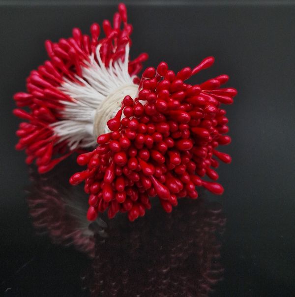 Små dekorationspistiller med fint pärlemorskimrande yta, fästa på tråd. Fina att matcha med olika blomsterarrangemang till kort, presentinslagningar och andra layoutprojekt. De cirka 3 millimeter breda pistillknopparna finns i båda ändar av stjälken som är cirka 5 centimeter lång.