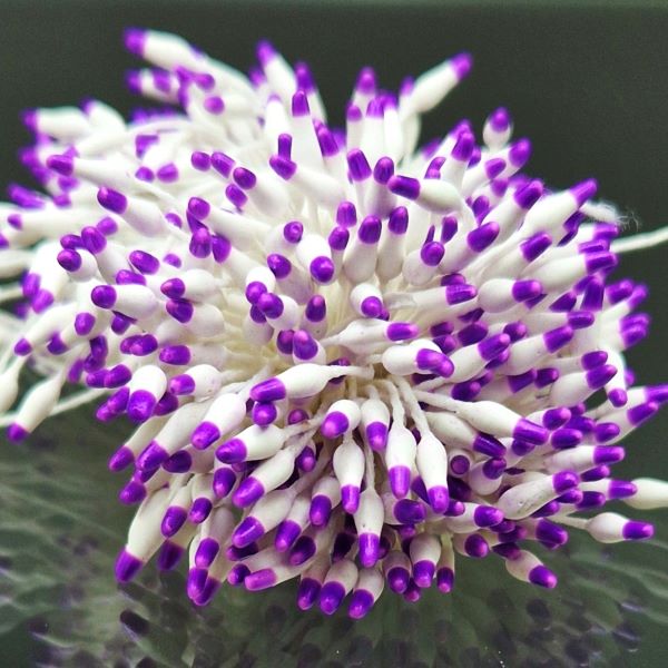 Små tvåfärgad dekorationspistiller med matt yta, fästa på tråd. Fina att matcha med olika blomsterarrangemang till kort, presentinslagningar och andra layoutprojekt. De cirka 2 millimeter breda pistillknopparna finns i båda ändar av stjälken som är cirka 5 centimeter lång.