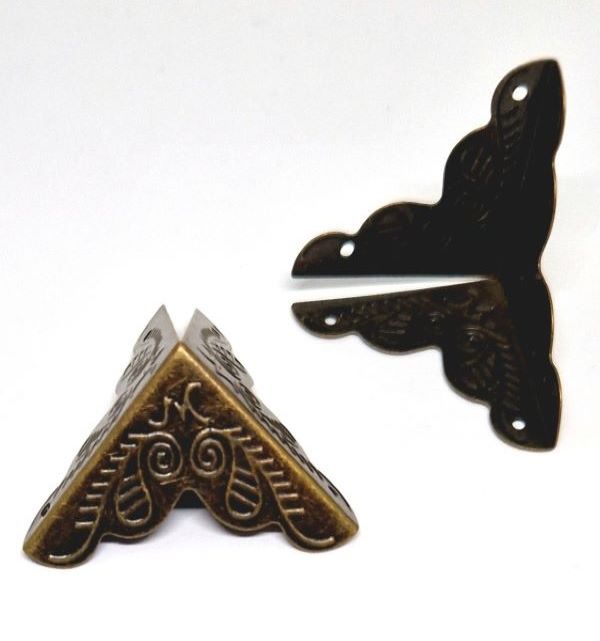 Dekorationshörn tillverkade i metall. Passar som dekoration och för att skydda hörn på böcker och album med mera vid bokbindning. Små spikar medföljer