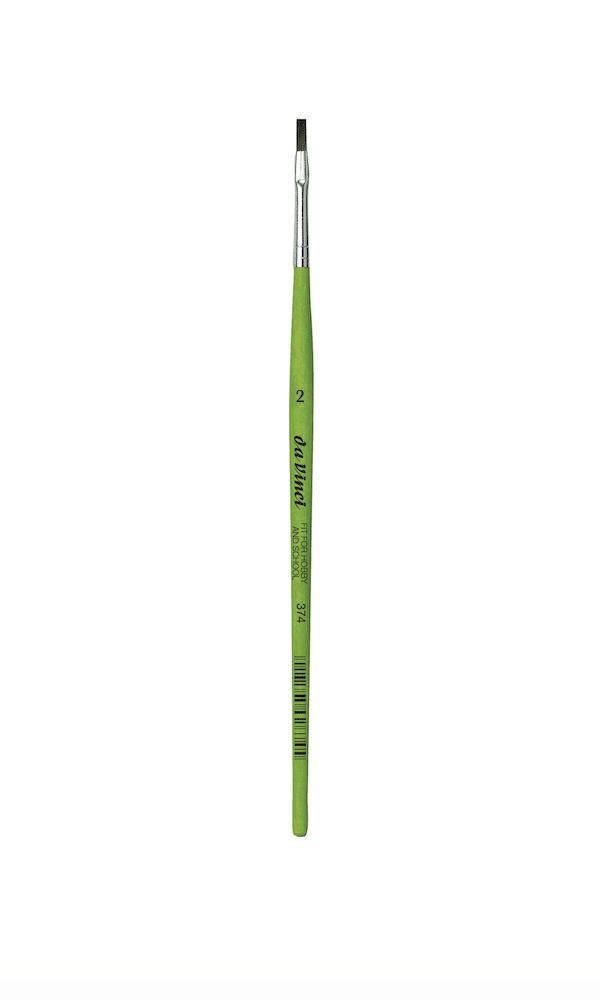 School 374 – en högkvalitativ pensel med platt spets från Da Vinci som passar perfekt för hobby och skola. Grönt, greppvänligt skaft samt en hylsa tillverkad i aluminium. Då penselstråna tillverkas av syntetiskt material kan vi också rekommendera penseln till alla veganer. Tillverkad i Tyskland.