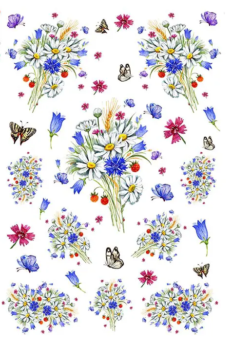 Decoupagepapper tillverkat av långa mullbärsfibrer, vilket gör det mycket hållbart. De tryckta mönstrena och bilderna kan antingen klippas eller rivas ut för att sedan klistras fast på önskat underlag.