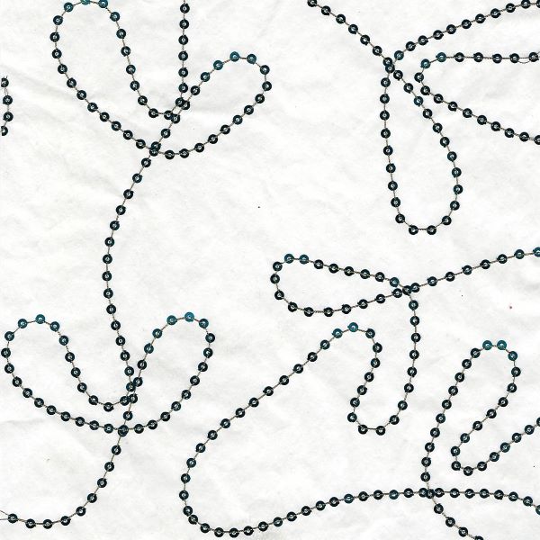 Handgjord indiskt papper med gröna paljetter, som är sytt med guld tråd på papper.