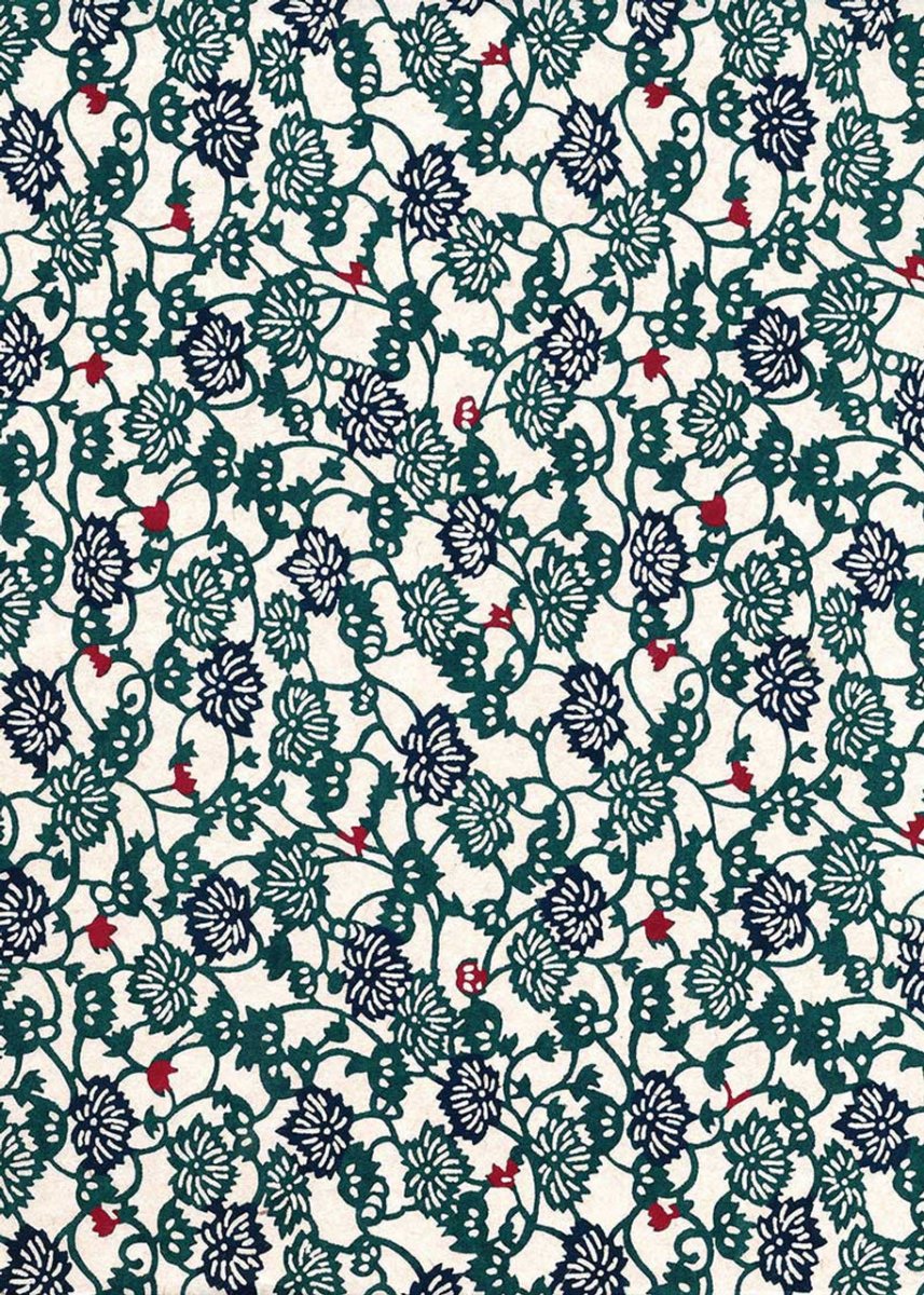 Dessa eleganta, djärvt mönstrade papper tillverkas helt för hand och är tidskrävande att producera. Baspappret behandlas först med sojajuice så att pigmenten kan binda till pappret. En resistpasta trycks genom en handskuren stencil på det behandlade pappret och får torka innan de sojabaserade färgerna stencileras på. Efter att även dessa färger har torkat tvättas pastaresisten bort för att avslöja de vita eller pappersfärgade områdena i mönstret. Styrkan och den tidlösa skönheten hos dessa specialpapper gör dem perfekta för bokomslag, lådor, kort, collage, lampskärmar och mer.