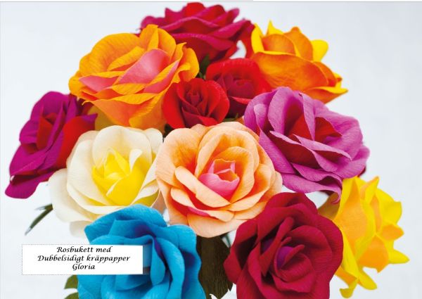 Dubbelsidigt kräppapper Gloria tillverkade av Werola i Tyskland. Det dubbla kräpppappret har olika färger på varje sida. De finjusterade färgkombinationerna inspirerar till en naturlig ljus- och skuggeffekt. 90 % stretch gör det lätt att forma föremål.