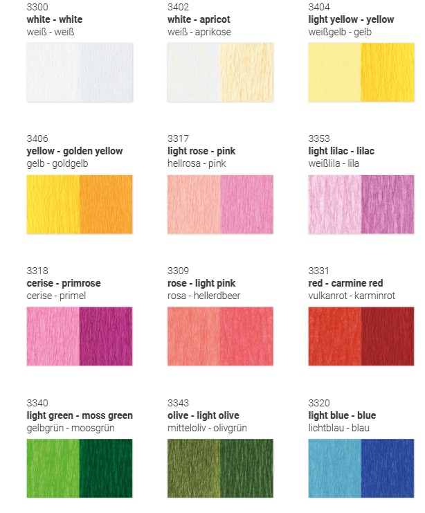 Dubbelsidigt kräppapper Gloria tillverkade av Werola i Tyskland. Det dubbla kräpppappret har olika färger på varje sida. De finjusterade färgkombinationerna inspirerar till en naturlig ljus- och skuggeffekt. 90 % stretch gör det lätt att forma föremål.