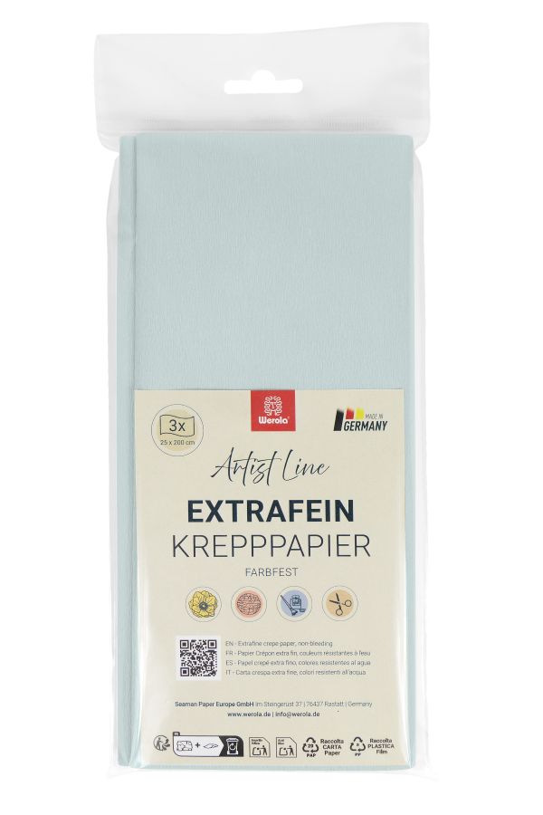 Kräppapper Artist Line, tillverkad i Tyskland av Werola. Den extra fin kräppapper med sina vackra pastellfärger är väl lämpad för utomhus dekorationer och hantverk, liksom för pappersblommor. 130 % stretch gör det lätt att forma föremål.