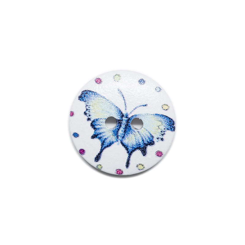 Knapp tillverkad i trä med två stycken hål i, motiv/mönster på framsidan och enfärgat vit på baksidan. Passar fint att använda som dekoration till dina lådor, album, scrapbookingkort och självklart till olika sömnadsprojekt. Pris per styck.