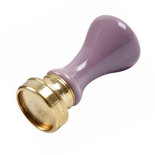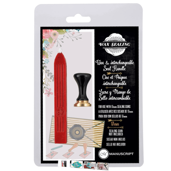 Förseglingshandtag i svartmålat trä för stämpling av vax samt en röd vaxstav. Handtaget passar för 18 millimeter breda vaxsstämplar som kan köpas separat. Handtaget ser likadant ut som i bild 2 och 3 fast med svart handtag istället för lila.